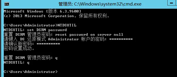 reset password on server null #在当前域控制器上恢复DSRM密码