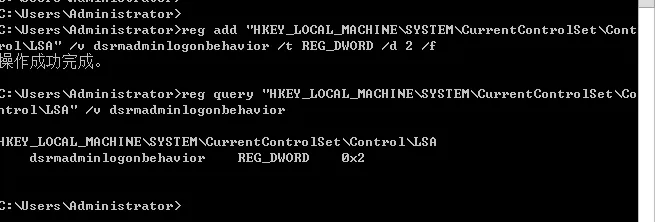 ps:在windows对DSRM登录进行了限制,我们需要将该值该为2。